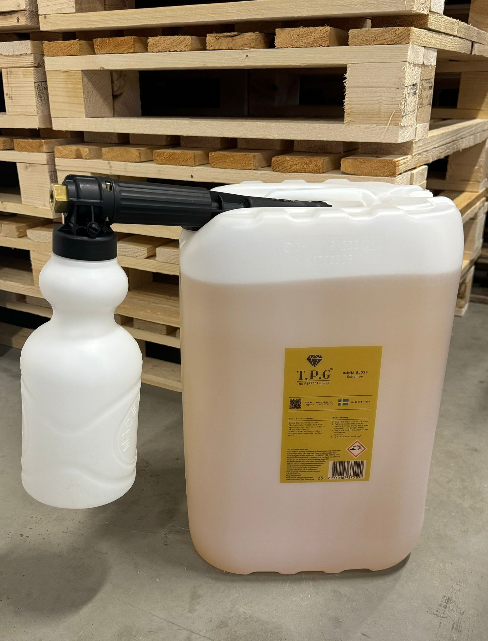 LS-12 Skumlans är perfekt för både proffs och entusiaster, med justerbar skumdosering för bästa resultat. Adapter för högtryckstvätt säljs separat. Omnia Gloss Schampo från TPG ger högskum, utmärkt avrinning och en härlig doft. Det fungerar på alla fordon och ger en blank, ren yta med minimal risk för vattenfläckar.