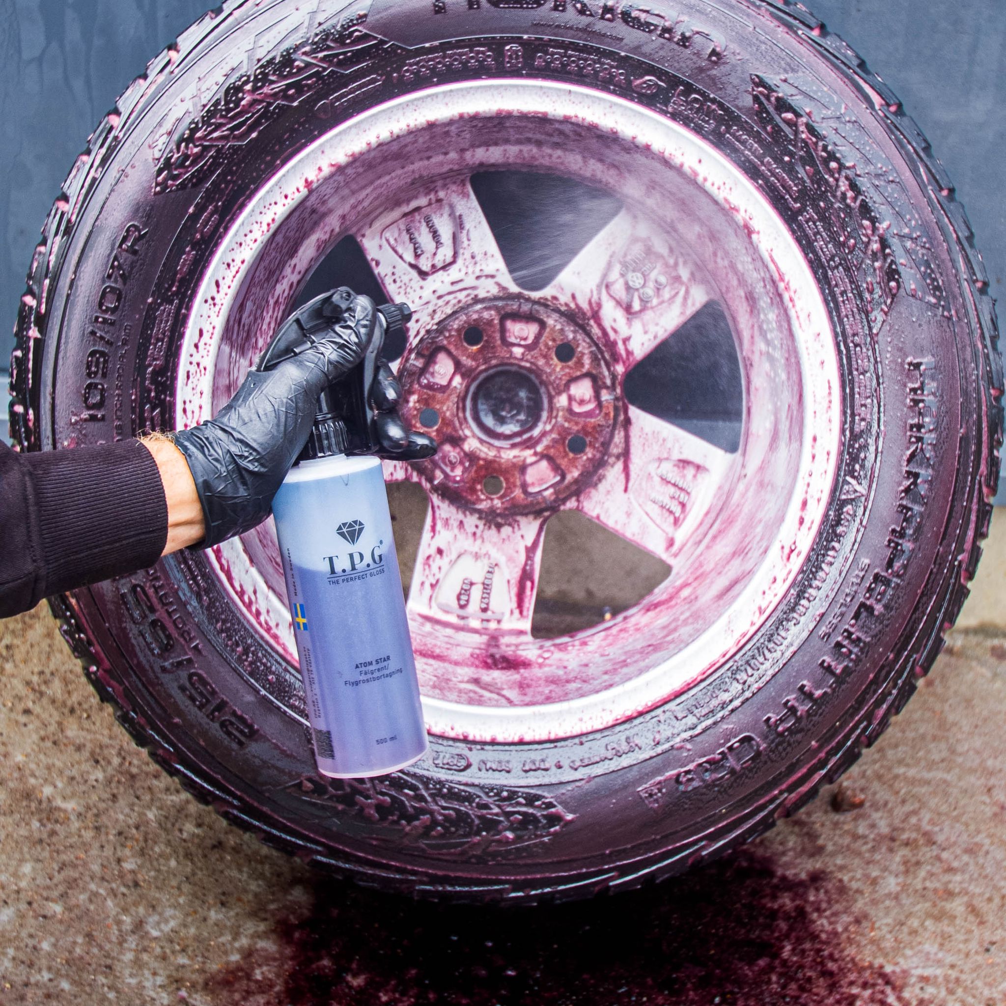 Atom Star från TPG, The Perfect Gloss, är en specialformulerad produkt framtagen för att effektivt rengöra fälgar och karosseri. Den unika formulan gör att produkten ändrar färg till lila när den har löst upp smutsen och är redo att sköljas av, vilket garanterar en perfekt ren yta.